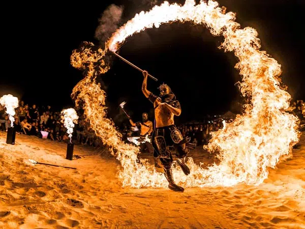 L’artiste jongle avec les flammes des staffs feu et fait virevolter les éventails ardents. D’ailleurs, ses mouvements hypnotiques captivent le public dès le premier instant. Les enfants applaudissent, et les adultes s’étonnent du charisme du performer.