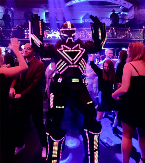 Réservez votre robot Led à Monaco. Échassier lumineux et laser, une animation futuriste. Discothèque, mariage, Bar Mitzvah, événementiel.